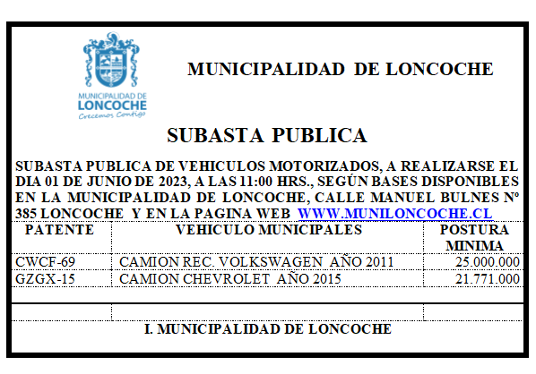 1.- La Municipalidad de Loncoche llama a Remate Público para remate de Vehículos Municipales.