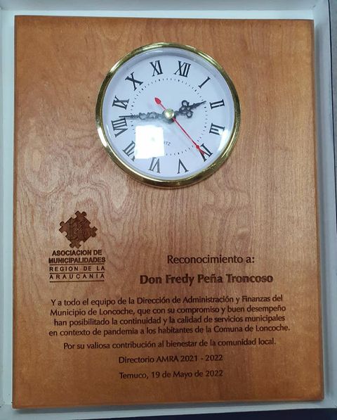 En la Universidad Autónoma en Temuco se realizó una jornada de análisis de gestión de finanzas municipales organizado por la Asociación de Municipalidades Región de la Araucania, AMRA, ocasión en que el Departamento de Administración y Finanzas de la Municipalidad de Loncoche, liderado por Freddy Peña, recibió un reconocimiento por «su compromiso y buen desempeño que han posibilitado la continuidad y la calidad de servicios municipales en contexto de pandemia».