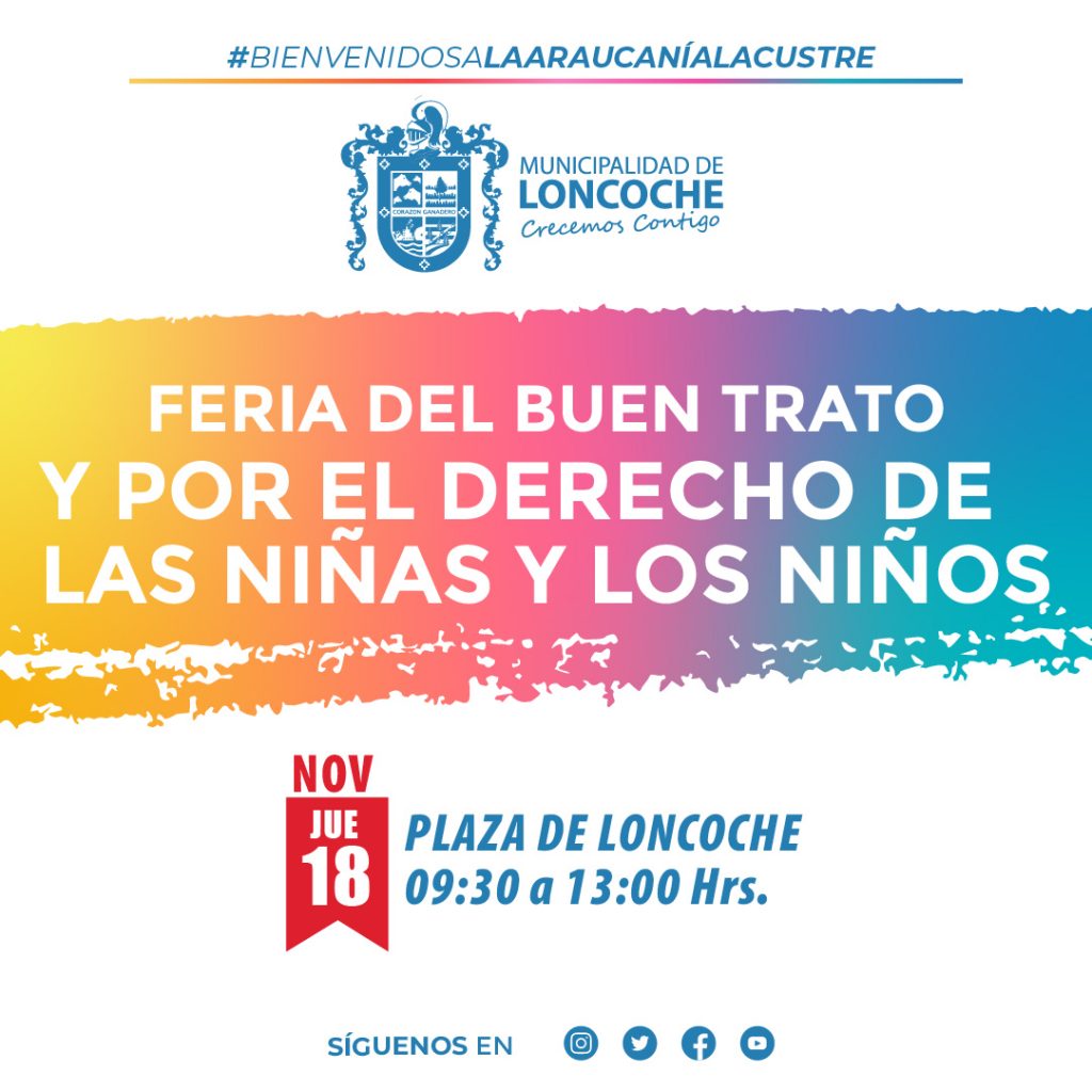Te invitamos a la feria del buen trato y por el derecho de las niñas y de los niños que se realizará este jueves 18 de noviembre desde las 09:30 horas en la plaza de Loncoche. Actividad liderada por nuestro alcalde Alexis Pineda y la dirección de Desarrollo Comunitario junto a OPD Cautín Sur.