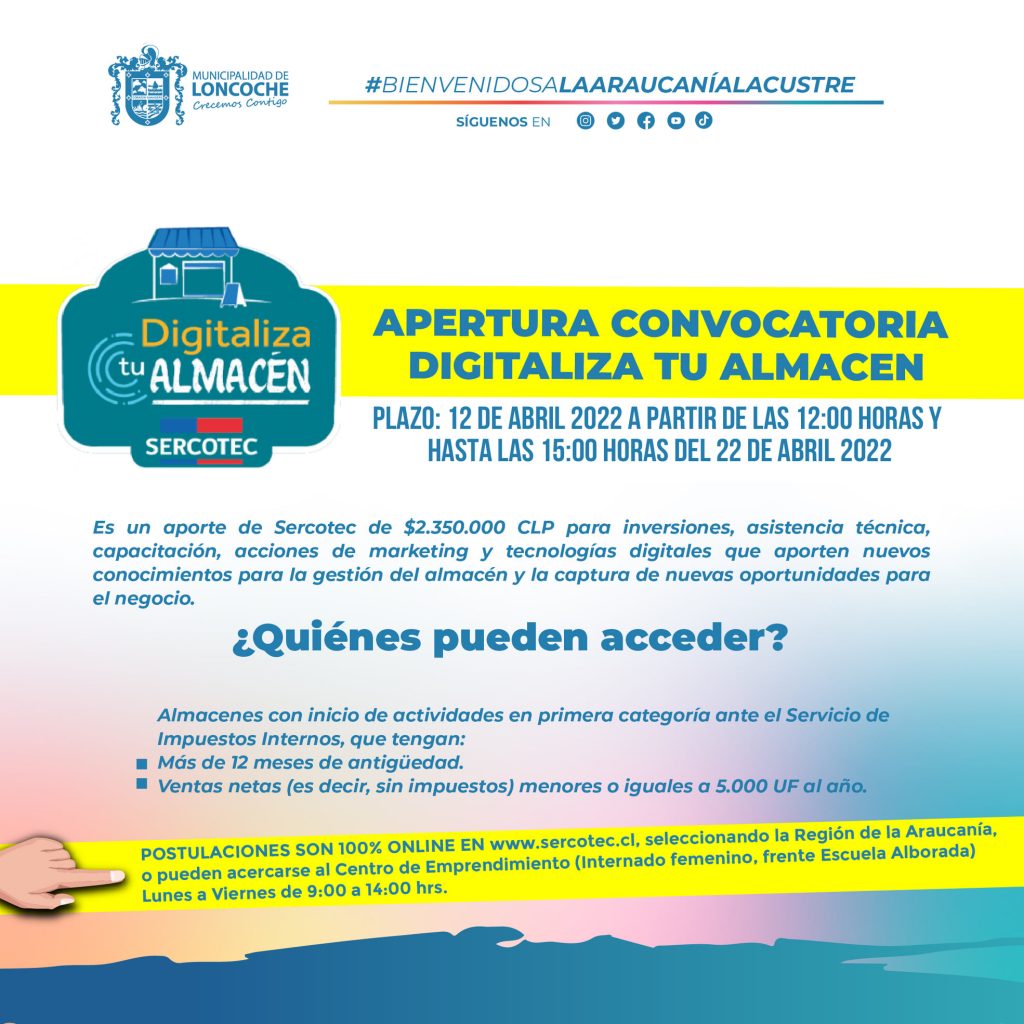 informó la apertura de la postulación de la convocatoria “Digitaliza Tu Almacén”, la que se encontrará abierta hasta las 15 horas del día viernes 22 de abril. “Digitaliza tu Almacén” es un subsidio, no reembolsable, destinado al crecimiento de los Almacenes de Chile a través de la implementación de un proyecto postulado, el que debe incluir financiamiento de inversiones y de acciones de gestión empresarial, entre éstas, el uso de tecnologías digitales que aporten nuevos conocimientos para la gestión del almacén y la captura de nuevas oportunidades de negocio. Sercotec financiará las Acciones de Gestión Empresarial y/o Inversiones identificadas, por un valor de hasta $2.350.000 netos.