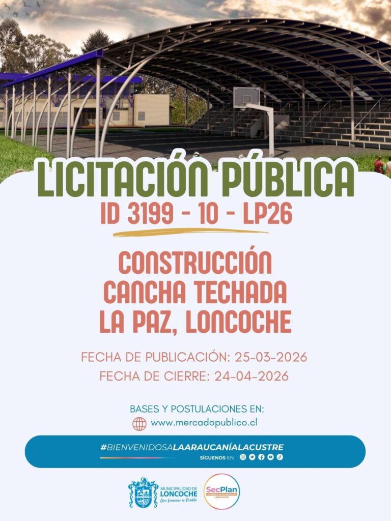 La Ilustre Municipalidad de Loncoche informa a la comunidad y a las empresas interesadas que se ha abierto el proceso de licitación pública para la construcción de la cancha techada del sector La Paz, un proyecto largamente esperado por vecinos y organizaciones deportivas de la comuna.