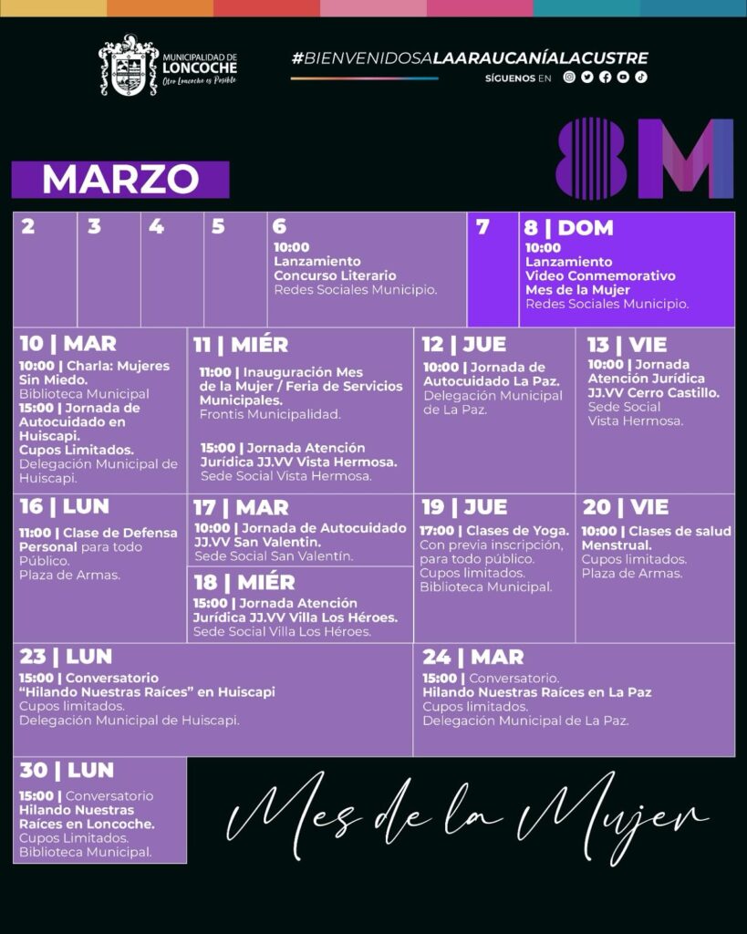 Durante todo este mes, la Municipalidad invita a la comunidad a ser parte de una serie de actividades organizadas en conmemoración del Mes de la Mujer, espacios pensados para reconocer, visibilizar y valorar el importante rol de las mujeres en nuestra sociedad.