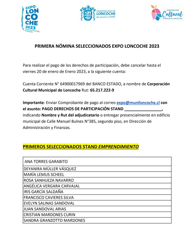 Importante: Enviar Comprobante de pago al correo expo@muniloncoche.cl con